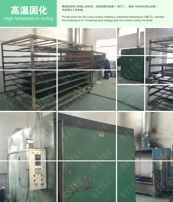 將噴涂好的(de)工件(jian)推(tui)入固(gu)化(hua)爐,加熱(re)到(dao)預(yu)定溫度(du)(185℃),保持 15分鐘后(hou)停止(zhi)加熱(re),開爐取(qu)出工件(jian)冷卻。